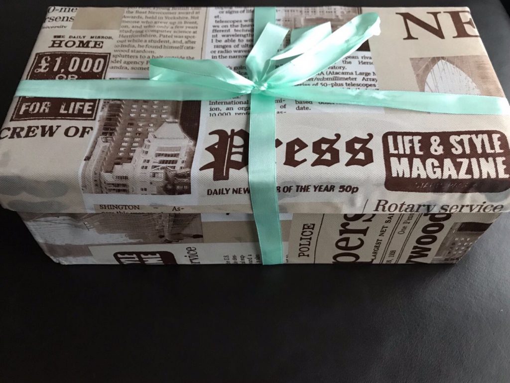 Linda versierde de doos, waarin de cadeautjtes zaten, met een stof van een Amerikaans magazine. Echt supergaaf gedaan.