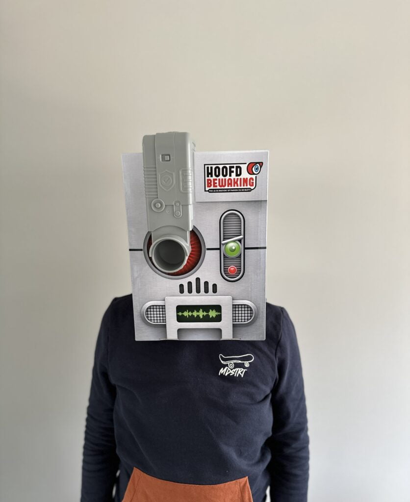 - de doos van het spel zelf waar je de camera en het elastiek aan kan bevestigen, zodat je hem over je hoofd kunt doen en dus echt hoofd bewaking wordt.