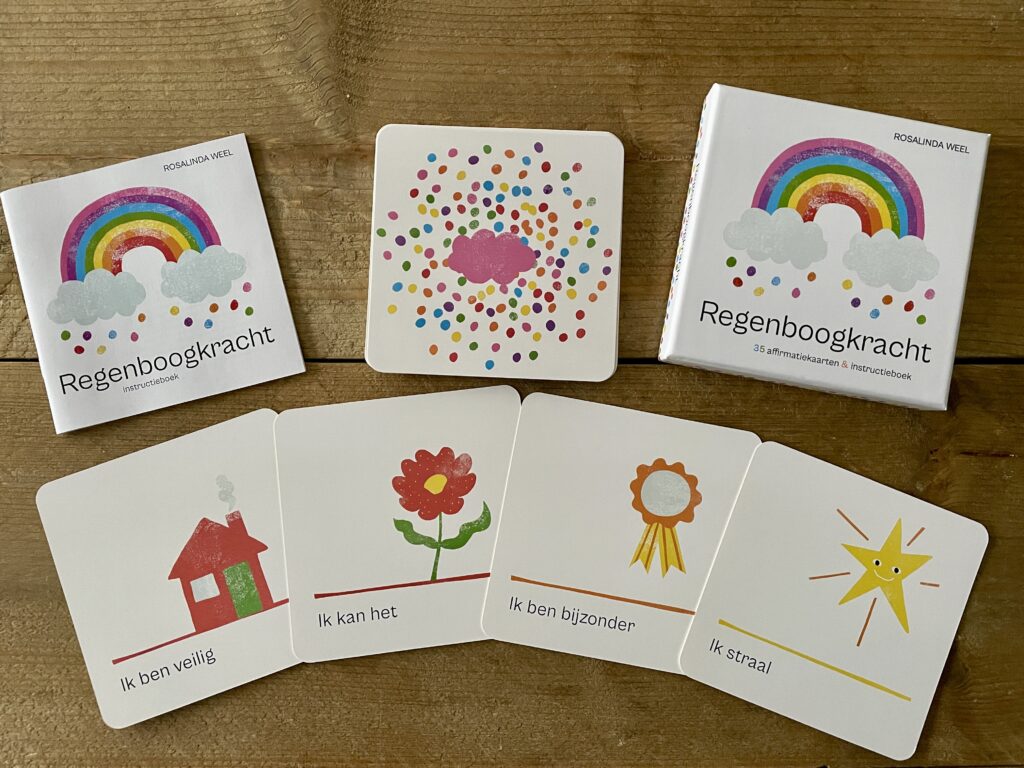 - Maak een regenboog; neem van alle kleuren één kaart en laat het kind in de volgorde van de kleurenregenboog de affirmaties opzeggen. Zo maak je een regenboog van de dag.