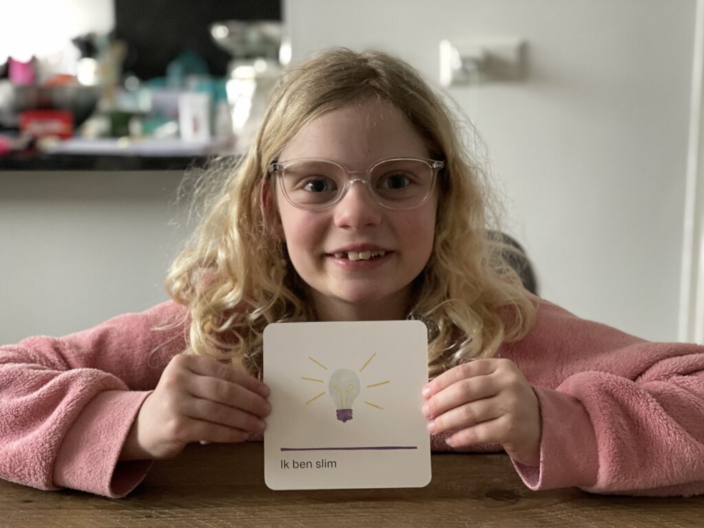 Het mooie van affirmatiekaarten vind ik zelf altijd dat je ze in kan zetten op de manier die jij als prettig ervaart. Zo gebruiken wij geel, oranje en rood vaak ’s ochtends voordat ze naar school gaan, om ze bijvoorbeeld voor een toets net dat beetje meer zelfvertrouwen te geven of om meer te geloven in zichzelf. Paars, roze, blauw en groen passen bij ons weer meer bij het avondritueel. Zo kunnen ze proberen aan te geven hoe ze zich voelen of ze liefde hebben ervaren op de dag en om ze te kunnen laten ontspannen voor ze gaan slapen. Voor ons zijn de kaarten een fijne aanvulling.