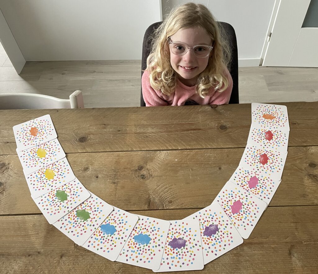 - Regenboogwaaier; schudt de kaarten en leg ze in de vorm van een regenboog neer met de voorkant boven. Het kind kan dan op gevoel een kaart trekken, zelf de kaart voorlezen of dit samen doen.