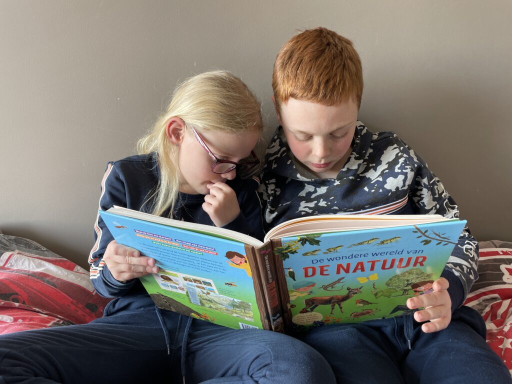 Hier in huis zijn ze altijd wel bezig met de natuur. Zijn ze niet op zoek naar beestjes, dan willen ze wel van alles weten over wilde dieren of een bezoek brengen aan de kinderboerderij of de dierentuin. Als ik met mijn planten bezig ben met verpotten of het maken van potgrond staan ze er met hun neus bovenop. De wondere wereld van de natuur kon dan ook niet ontbreken in de boekencollectie van de kinderen.