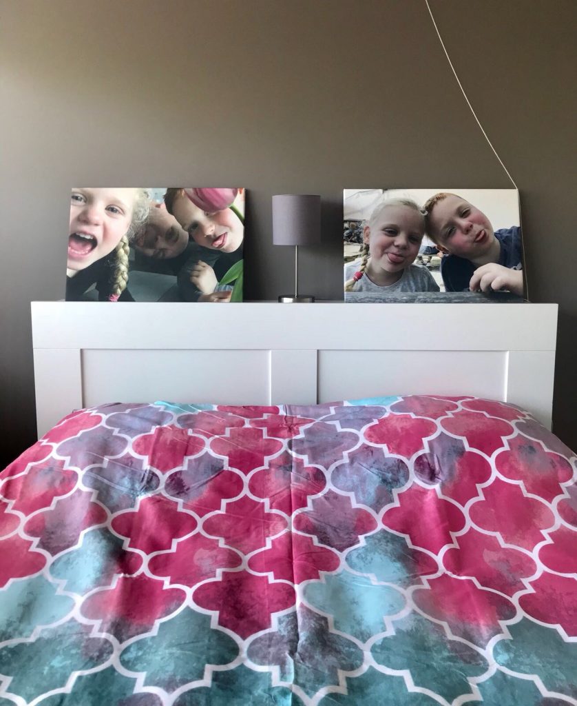 Hoe ik het dan toch gezellig maak in onze slaapkamer? Eigenlijk is dat heel erg simpel. Zo zette ik op het hoofdeinde van ons bed al canvasdoeken neer van mijn grote liefdes. Deze bevatten aardig wat kleur, waardoor ze er uit springen bij de mooie grijze kleur op de muur.