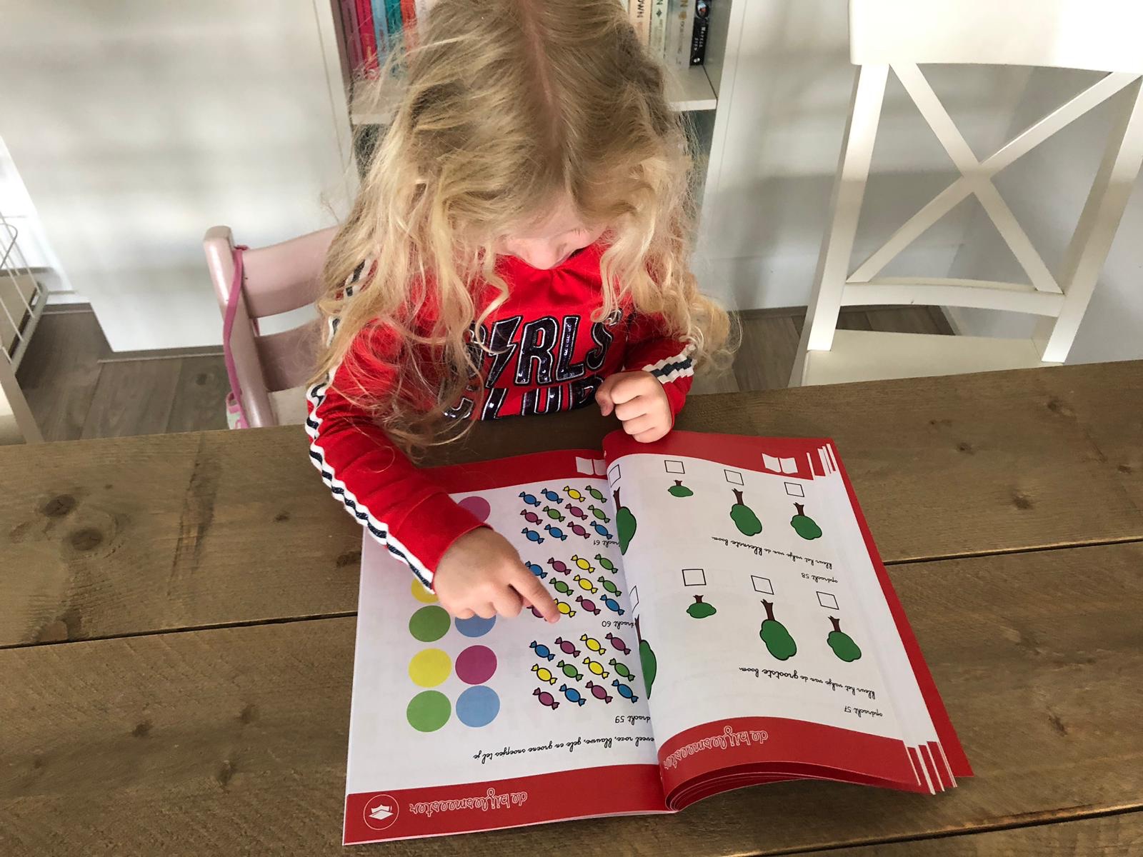 In het rekenboek staan oefeningen van leren klok kijken tot aan getallenreeksen. En van vraagstukjes, goed moment voor mezelf om opnieuw te leren, want ik vond het de hel, tot aan vormen herkennen. Ook hier is het de bedoeling dat je het samen doet met je kind. Jij leest voor en je laat je kind het rekenwerk doen. En waar nodig help je uiteraard.