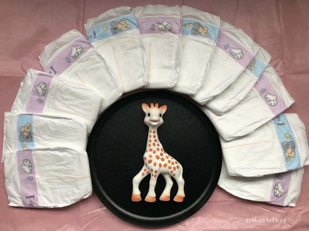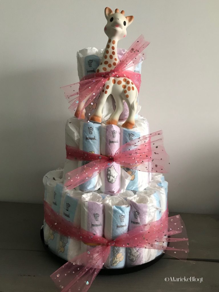 Ik vind de taart echt te cute en gelukkig dacht mijn vriendin er hetzelfde over. En was ze erg blij met deze, speciaal voor haar gemaakte, luiertaart.
