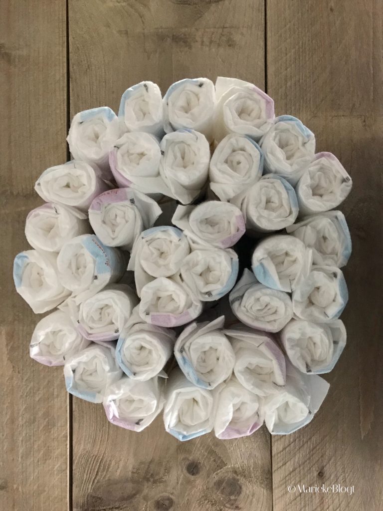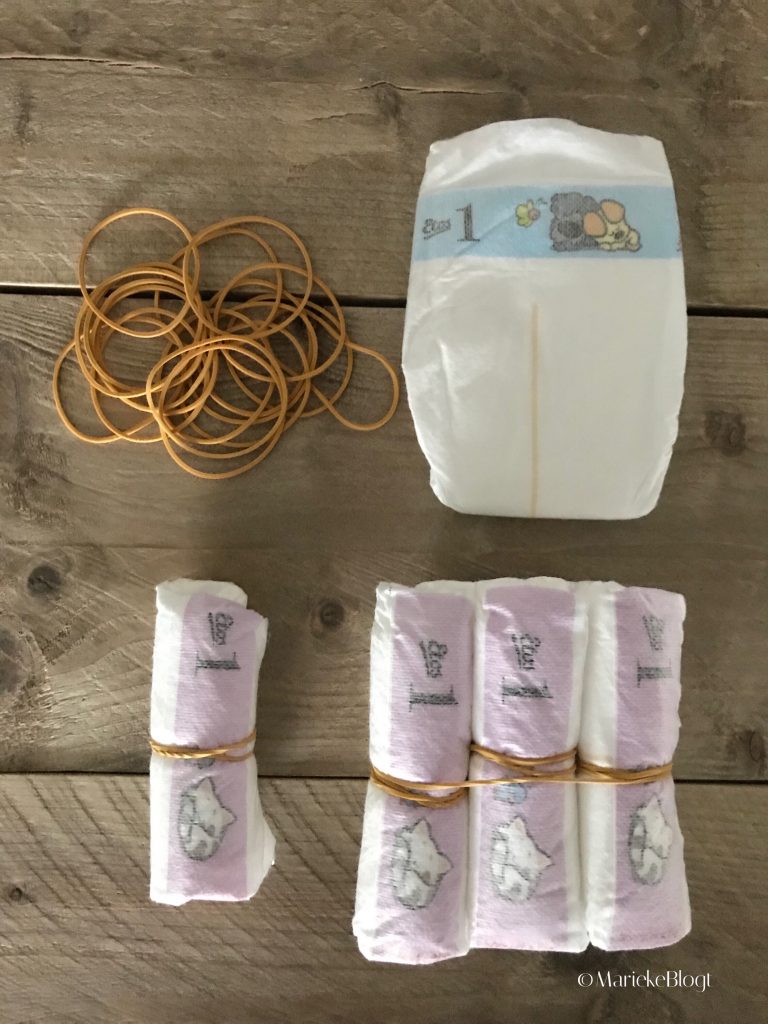 Van de luiers maak ik rolletjes, waar ik een elastiekje om doe, zodat ze vast blijven zitten. Als ik meerdere rolletjes heb, bind ik die ook weer samen vast met een elastiekje. En zo maak ik steeds groepjes van vijf voor de onderste laag, groepjes van vier voor de middelste laag en de bovenste bind ik alle rolletjes bij elkaar. Uiteraard kun je de lagen zo groot maken als je zelf wilt.