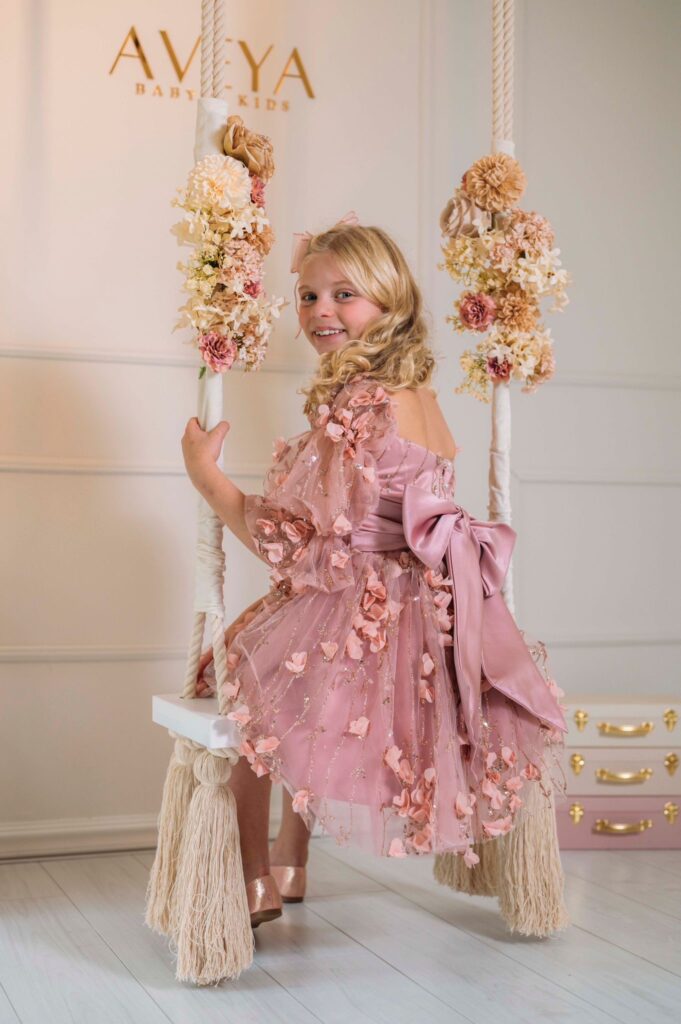 Hoewel ik de foto hierboven echt al helemaal geweldig vind, is er voor mij een jurkje waarin ik mijn tiener nog harder vind stralen dan in de Lara dress. Dit jurkje vind ik dus echt met recht een magical fairytale dress. Ik heb het over de Arabella fairytale dress vol met glitters en 3D bloemen. Op de rug zitten vier parelknoopjes, een ritssluiting en de eyecatcher, een grote satijnenstrik.
