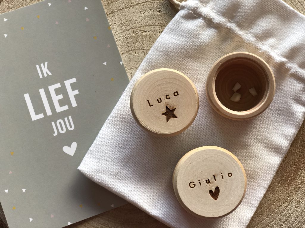 Als je googelt vind je dit leuke houten tandendoosje. Naast het bewaren van de tanden kun je hier ook wat meer informatie kwijt over je kindje zelf, zoals naam, geboortedatum en geboortegewicht. Daarnaast is het superhandig dat je de datum er bij kunt schrijven van wanneer de tanden er uit zijn gevallen. Het doosje is er in zowel een meisjes- als jongensvariant.