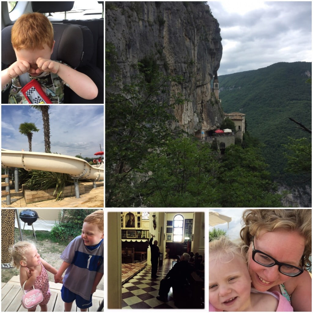 Het is ongeveer een halfuurtje rijden tot aan de parkeerplaats. We moeten wachten op een pendelbus, die ons naar beneden brengt. Gelukkig hebben we genoeg te zien aangezien ze van Abarth allerlei Fiatjes 500 en Spiders aan het testen zijn, iets wat niet alleen Erik heel leuk vindt om te zien 😉 Om tien over elf stappen we op de bus en worden we naar Madonna della Corona gebracht, een kerk die tegen een rotswand is gebouwd. Heel gaaf om te zien, alleen de kerk zelf viel behoorlijk tegen, voor Italiaanse begrippen was deze zelfs heel erg sober. We hebben er een halfuurtje rondgelopen en zijn toen weer teruggegaan richting de bus. Het laatste stukje zelfs nog gerend, anders sta je een halfuur te wachten op de bus.
