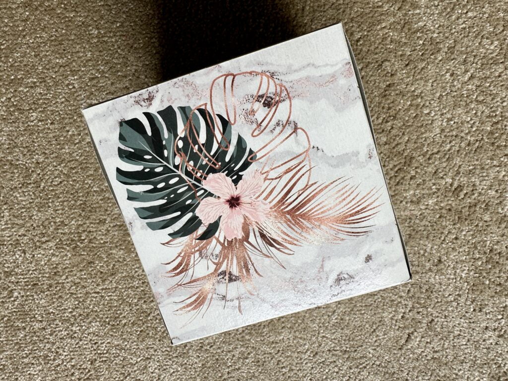Eigenlijk was ik op zoek naar herbruikbare wattenschijfjes toen ik op deze mooie doos tissues stuitte. Ik ben echt een sucker wat betreft mooie printjes, helemaal als het een botanische print in combinatie met roségoud is. De doos past helemaal bij mijn werkkamer.