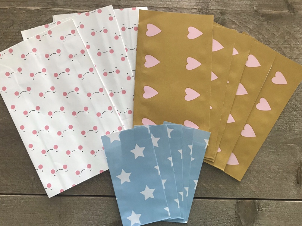 Nu we het dan toch over inpakken hebben, begin ik ook maar meteen met de cadeauzakjes. Er zitten drie varianten in. Wit met roze gezichtjes van Eef Lillemor, goud met roze hartjes en blauwe met sterretjes. Vooral die van Eef Lillemor vind ik erg schattig. De zakjes zijn erg handig om kleine cadeautjes in te doen of om als envelopje te gebruiken voor een kaartje.