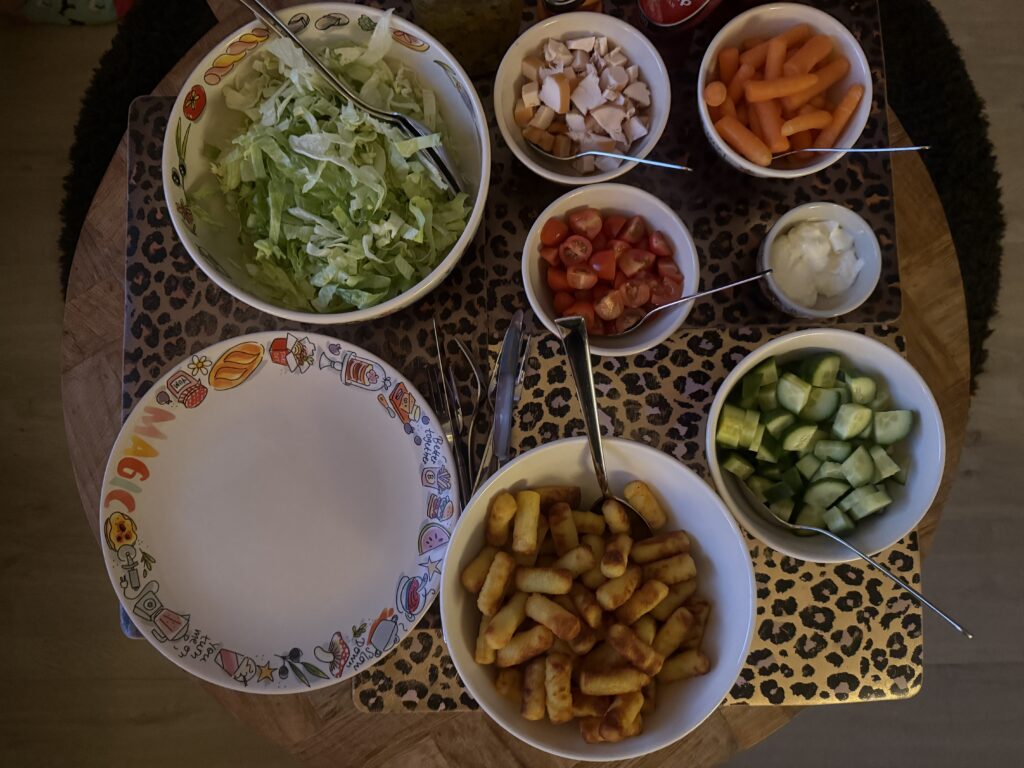 Aangezien de vorige keer de build your own salad in goede aarde was gevallen, doen we dat vandaag nog een keertje. Alles gaat schoon op en hebben we weer lekker veel vitaminen gegeten.