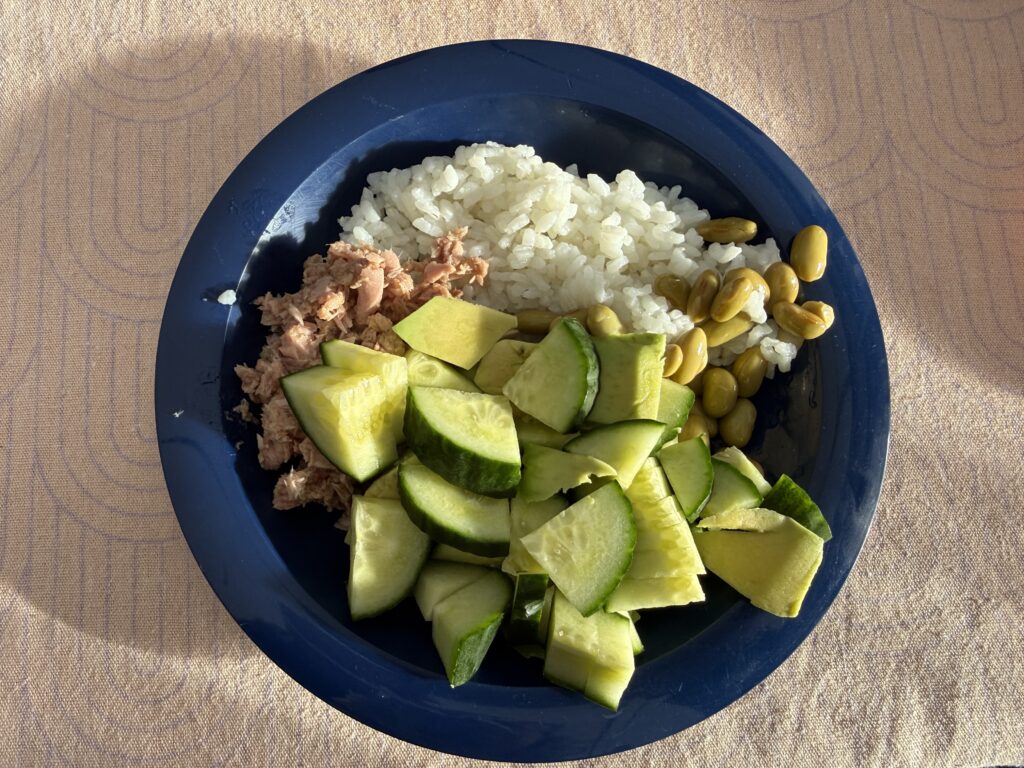 Voor het avondeten maak ik poke bowl klaar, helaas missen we wat ingrediënten, waardoor ik het toch minder lekker vind. Gelukkig heeft de buurvrouw nog pizza over en neem ik daar nog een stukje van.