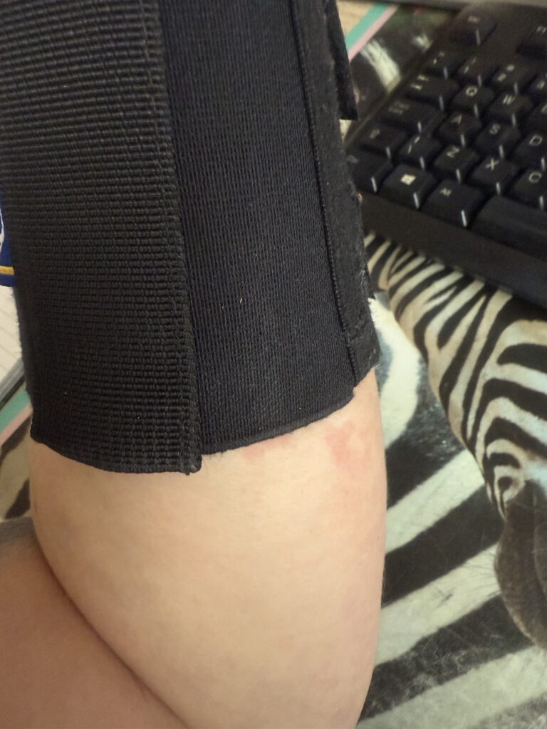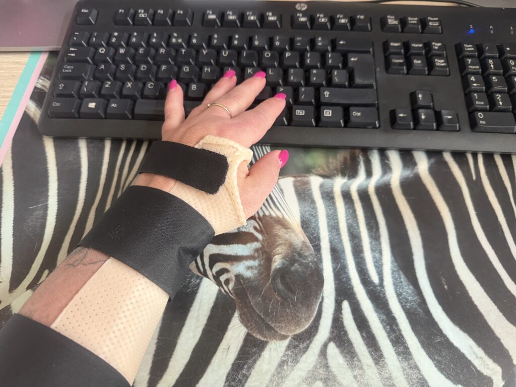 Ik heb het ook met de brace geprobeerd, maar wij zijn geen vriendjes als ik moet werken. Ik blijf namelijk een aantal keer precies met mijn vel tussen mijn bureau en de rand van de brace zitten en dat is vrij pijnlijk. De spalk dragen we dus met werken en de brace met slapen.