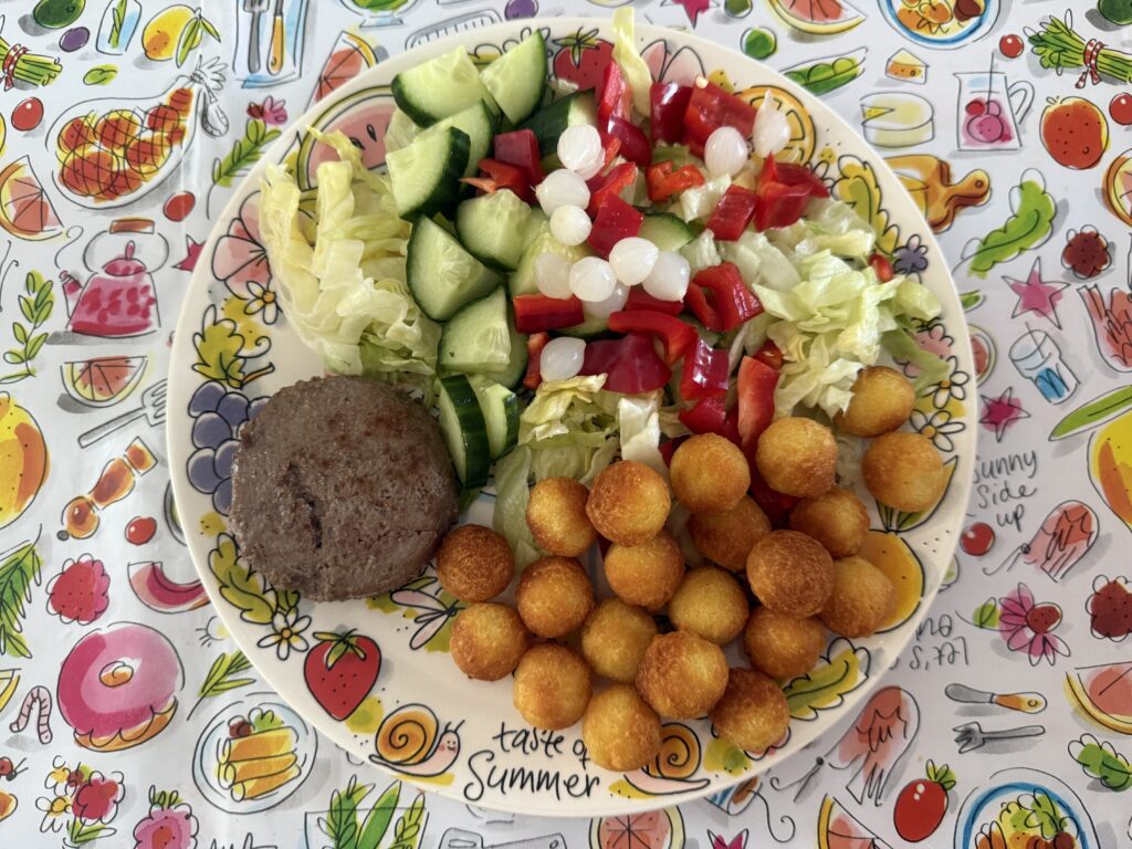 Ik heb geen trek in ingewikkeld gedoe voor wat betreft eten. Dus wordt het sla met een tartaar en aardappelballetjes.
