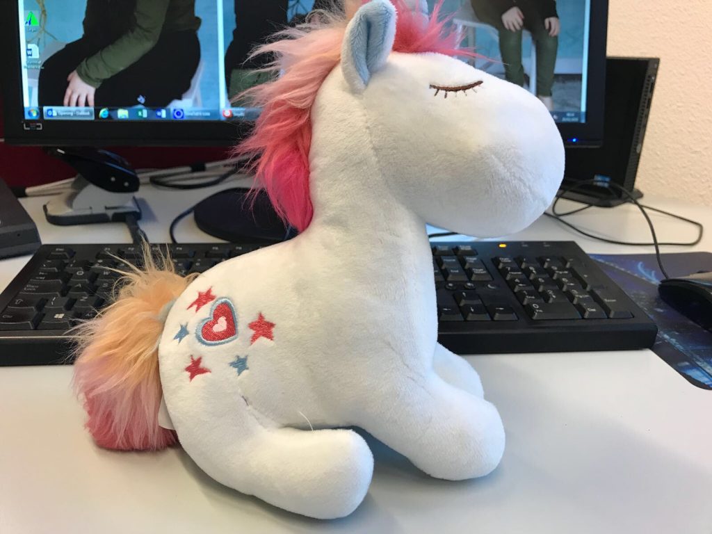 Ontvang ik mijn eerste geluksmomentje als ik op mijn werk kom. Eén van mijn lieve collegaatjes kocht een eenhoorn, voor Giulia, maar ik word er echt heel blij van.