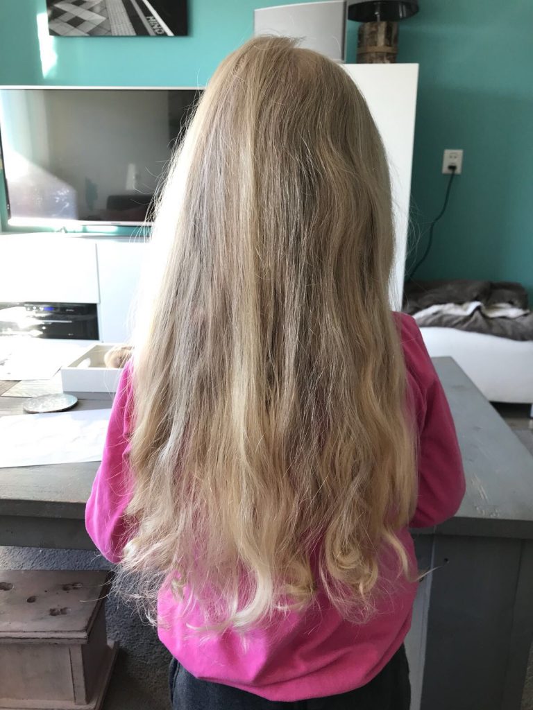 Als ik Giulia’s haar uitkam om vlechten te maken, wil ze graag zien hoe lang haar haren al zijn. Het hangt boven haar billen en als het nat is valt het zelfs op haar billen. Bizar hoe hard haar groeit eigenlijk.