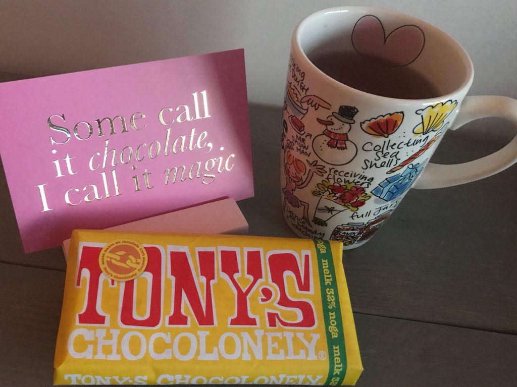 Nadat ik al twee keer bij Albert Heijn de Tony’s links heb laten liggen, lukt het me nu niet. En neem ik lekker mijn lievelings met noga mee. Superlekker bij een bakkie. Het kaartje is overigens van By Bird.