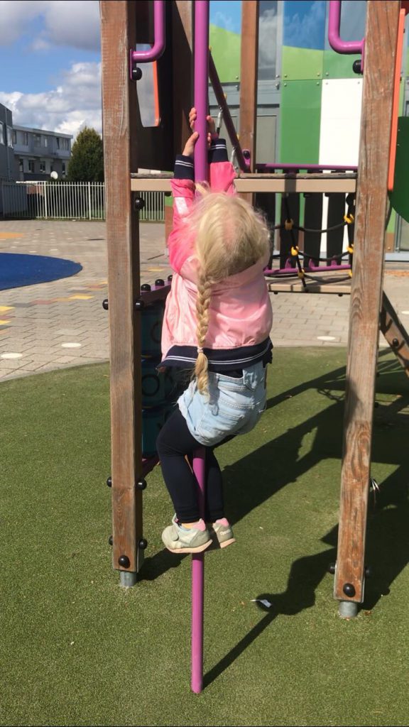 ’s Middags laat Giulia zien wat ze met buiten spelen heeft geleerd. De kleine daredevil gaat helemaal alleen via de paal naar beneden.
