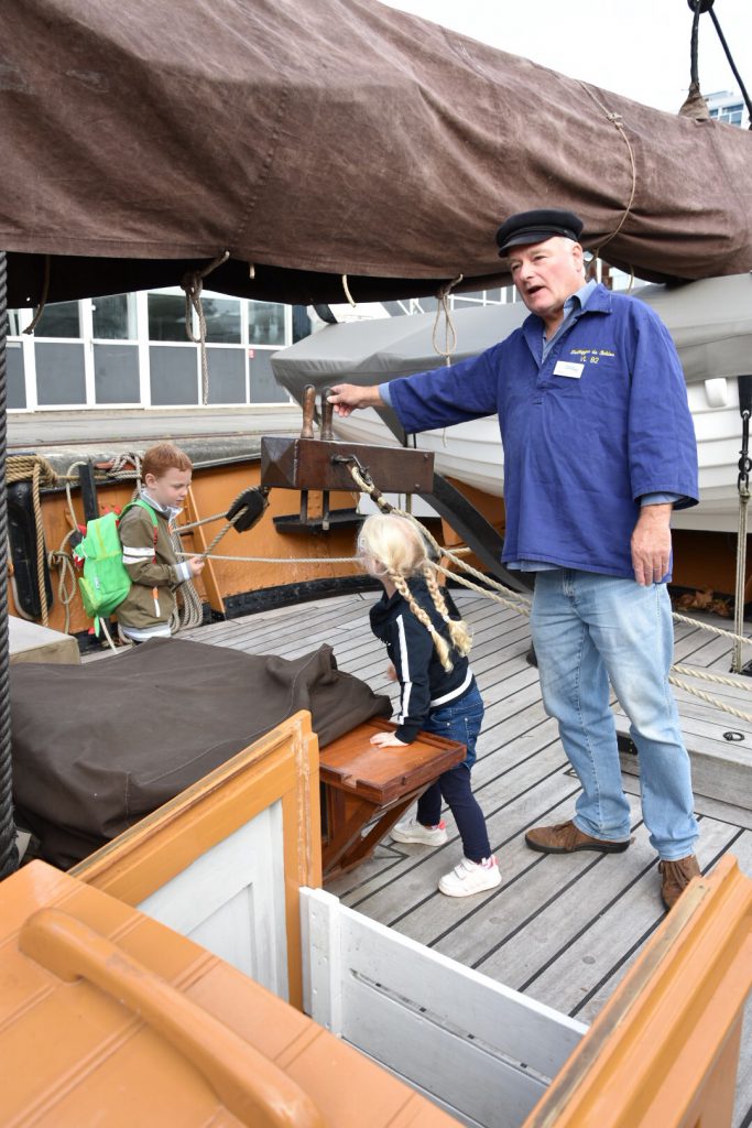 De kinderen mogen op een echte vissersboot van 106 jaar oud. We nemen een kijkje in de hut waar ze met twaalf man sliepen en ze mogen even aan het roer staan.