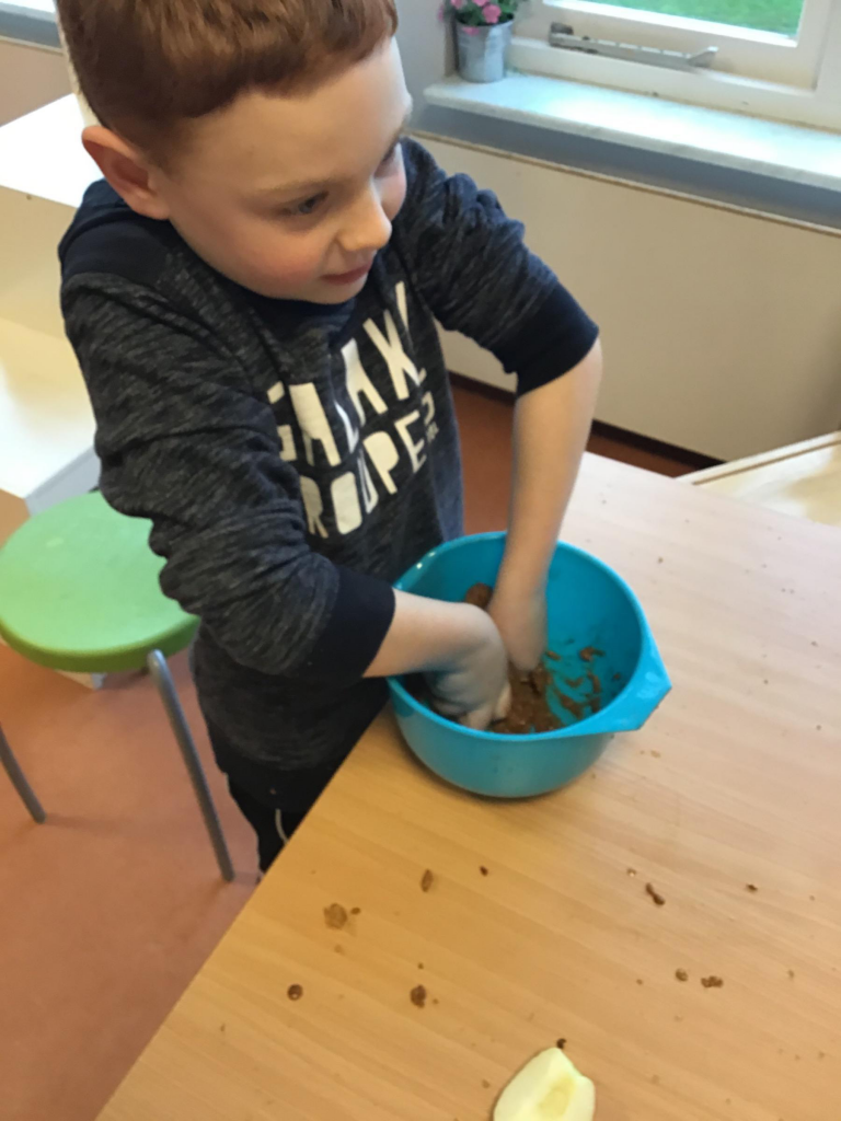 Op de bso maakt mijn bink samen met de leidsters poep, maar omdat het te dun is, kan het niet mee naar huis. Maar hij vond het helemaal geweldig om te doen.