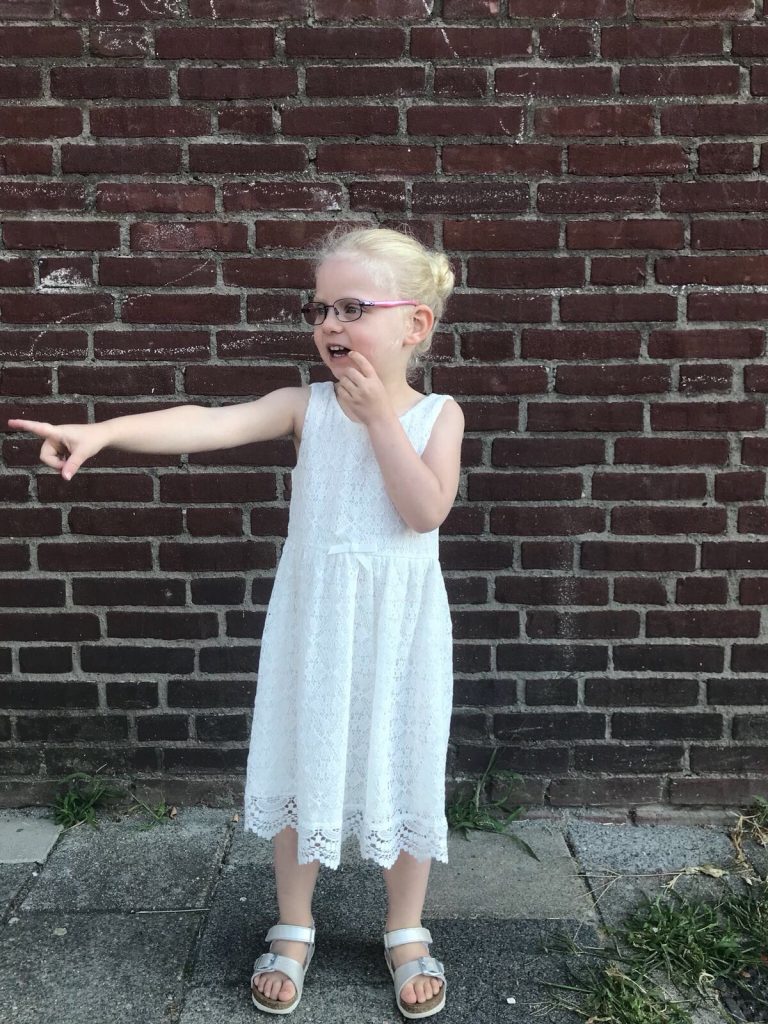 Mijn tuttebel en ik brengen samen mijn binkie naar school. En genieten van onze tijd samen, want dat is wel echt nodig, aangezien dat er de laatste tijd nogal bij ingeschoten is, door de drukte met werken. Ze wil graag op de foto met haar trouwjurk (bruidsmeisjesjurk van vorig jaar, alleen dan wel een maatje groter ;))