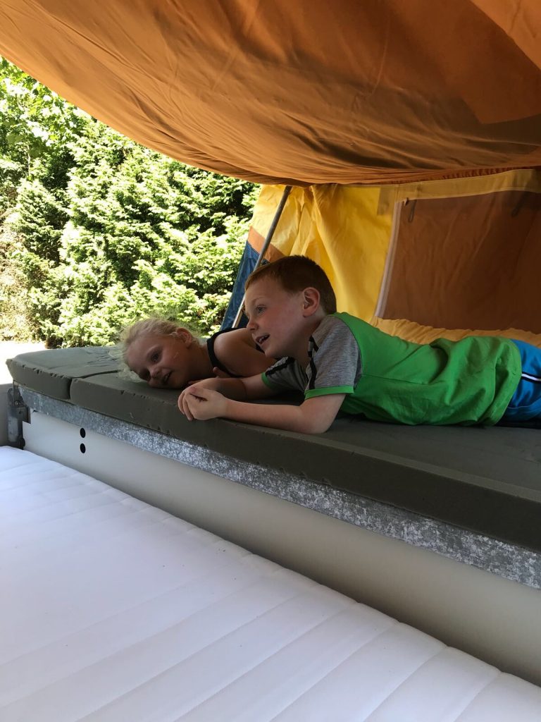 Aan het eind van de ochtend gaan we de vouwwagen opzetten. En er lopen meteen twee stuiterballen rond, die wel heel graag op vakantie willen. Het liefste nu al. Maar helaas moeten we nog vijf weken wachten.