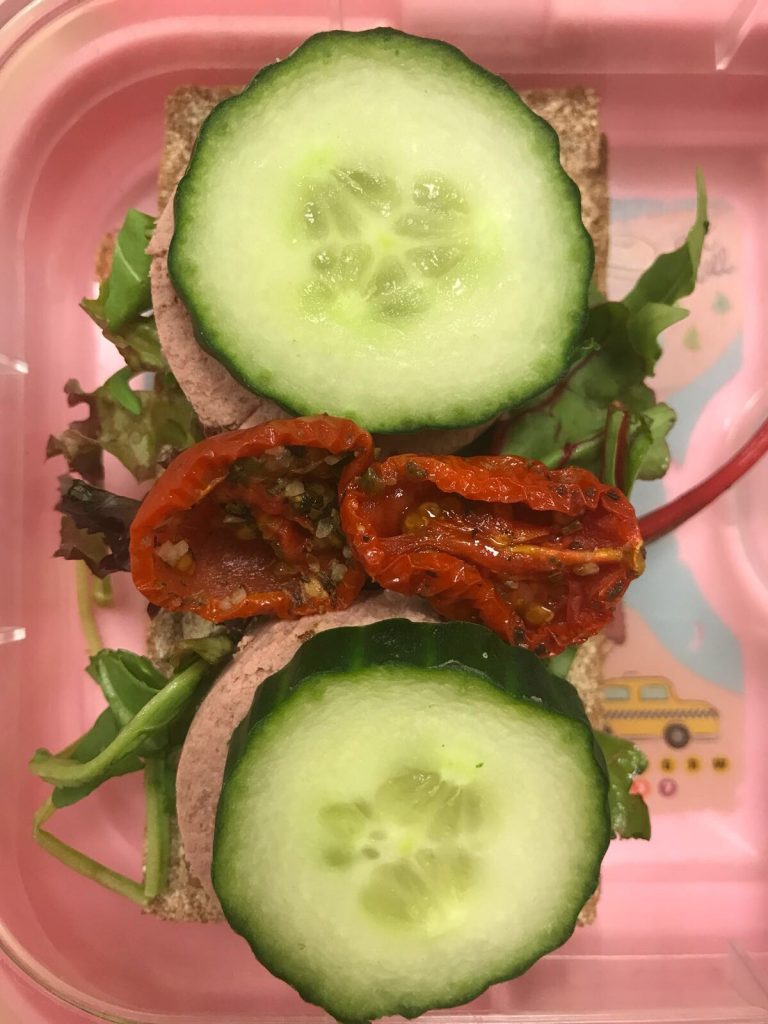 De maandag begint lekker, ik breng de kinderen naar de opvang. En heb een fijn werkdagje. Tussen de middag maak ik van mijn lunch een feestje. Crackers met sla, leverworst, komkommer en gedroogde tomaatjes. Overigens eet het wel enorm onhandig, maar een kleinigheidje houd je altijd.