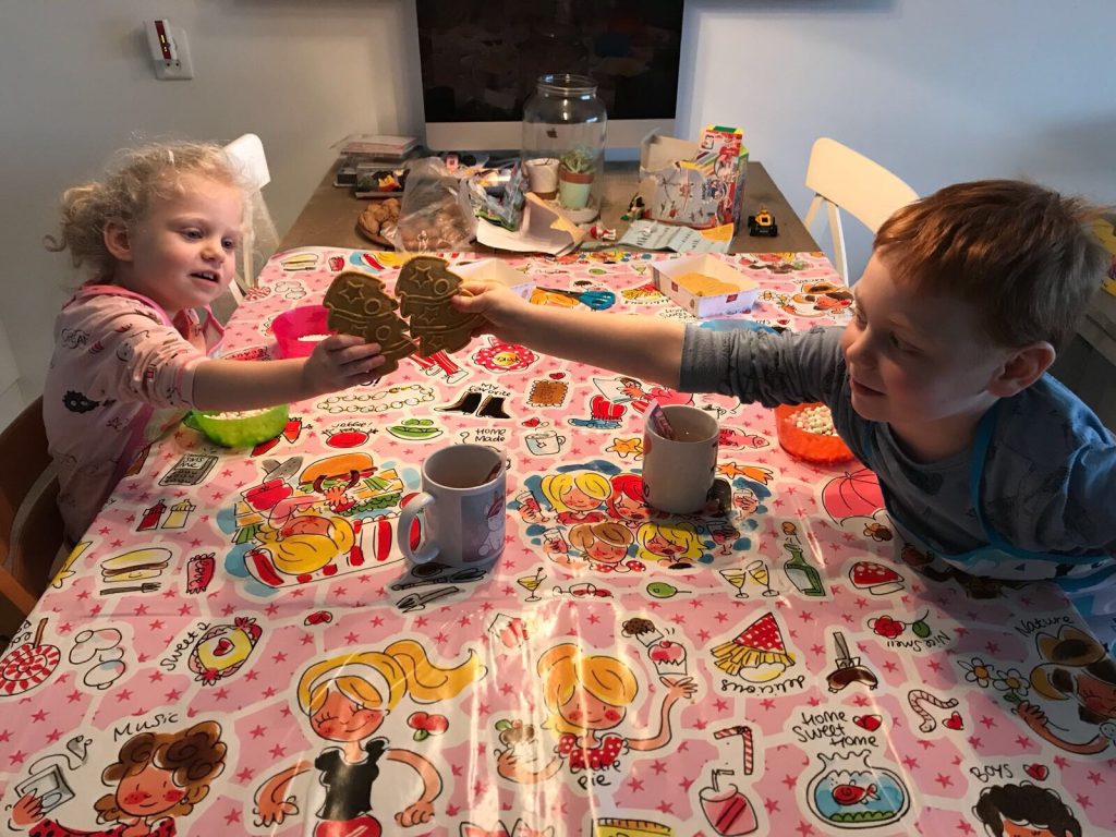 Begint al vroeg, maar we starten heerlijk rustig op. De kinderen versieren samen koekjes, die ik meenam bij de Lidl. Superhandig, want alles zit al in de verpakking.