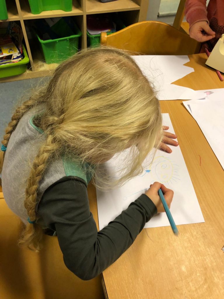 Als ik de kinderen ophaal van de bso, zit Giulia te tekenen. Ik blijf het bijzonder vinden hoe zij poppetjes tekent.