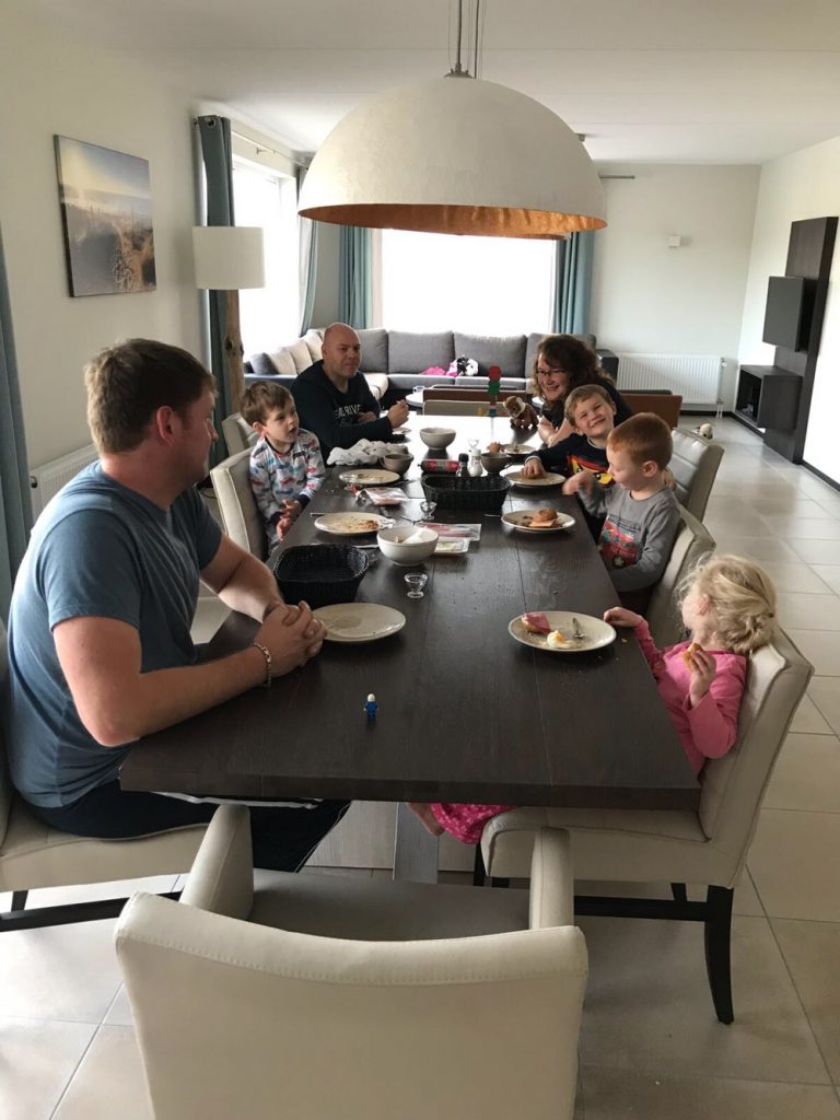 Ik word wakker van mijn olijke duo in de kamer naast ons. Ze liggen te kletsen. Ik kruip nog even bij ze, maar na twintig minuten zijn ze er klaar mee en gaan we naar beneden toe.
