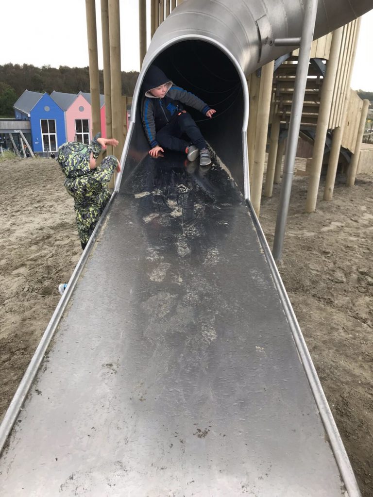 Daarna rijden we naar een restaurant, Zoet of Zout, waar de kinderen even lekker kunnen spelen in de grote steur die buiten staat.