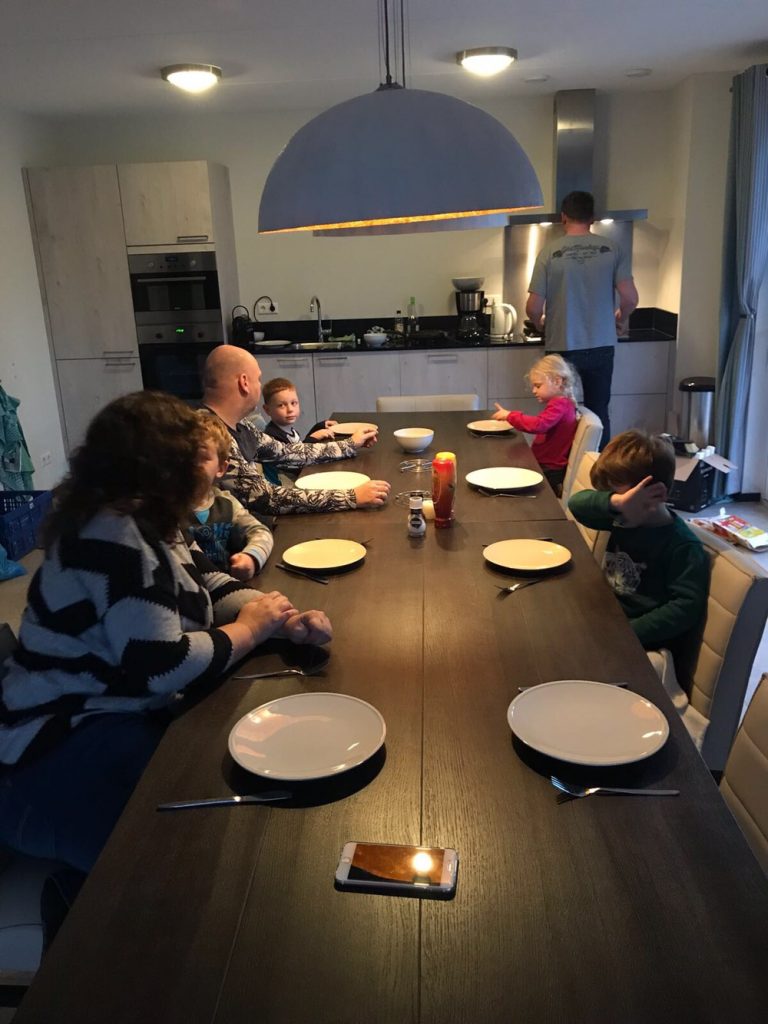 Rond half tien eten we met zijn allen aan de grote lange tafel.