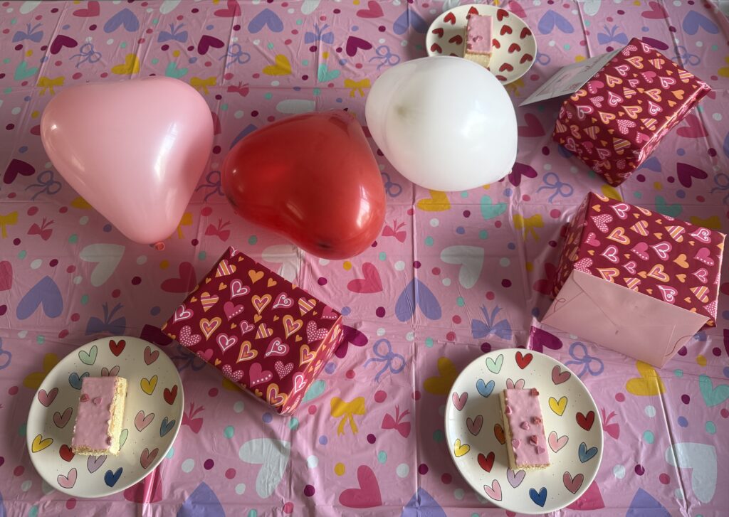 Eigenlijk doe ik niks aan Valentijnsdag, maar ik vind het wel altijd leuk om iets te doen voor de kinderen. Dus heb ik de tafel gedekt, Valentijnstompoucen gehaald en er ook nog een cadeautje bij gedaan. De kinderen zijn blij verrast.
