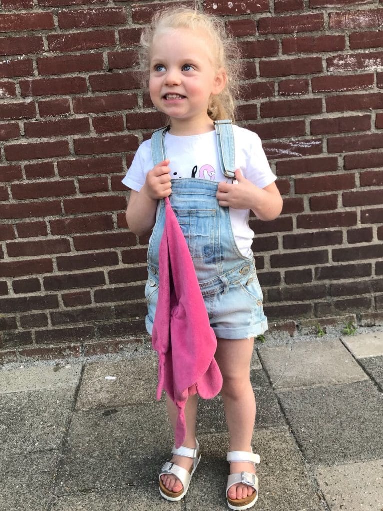 Vind ik dat Giulia zichzelf zo ontzettend leuk heeft aangekleed, dat ik haar wel even op de foto moet zetten, voordat ik haar naar de opvang breng. Haar outfit: shirtje van Zeeman (flamingo wordt roze door de warmte), tuinbroekje van Cars en sandaaltjes van Hush Puppies.