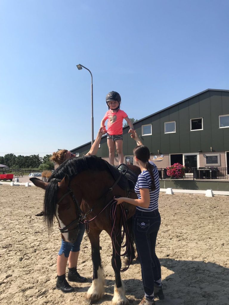Giulia wil niet op een pony rijden, maar wil wel graag op een paard rijden. En doet zelfs kunstjes op het paard.