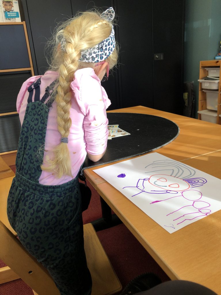 Mag ik met mijn tuttebel voor het eerst naar logopedie en ze doet het echt heel erg goed. Ze maakt een mier, die volgens haar op mij lijkt.