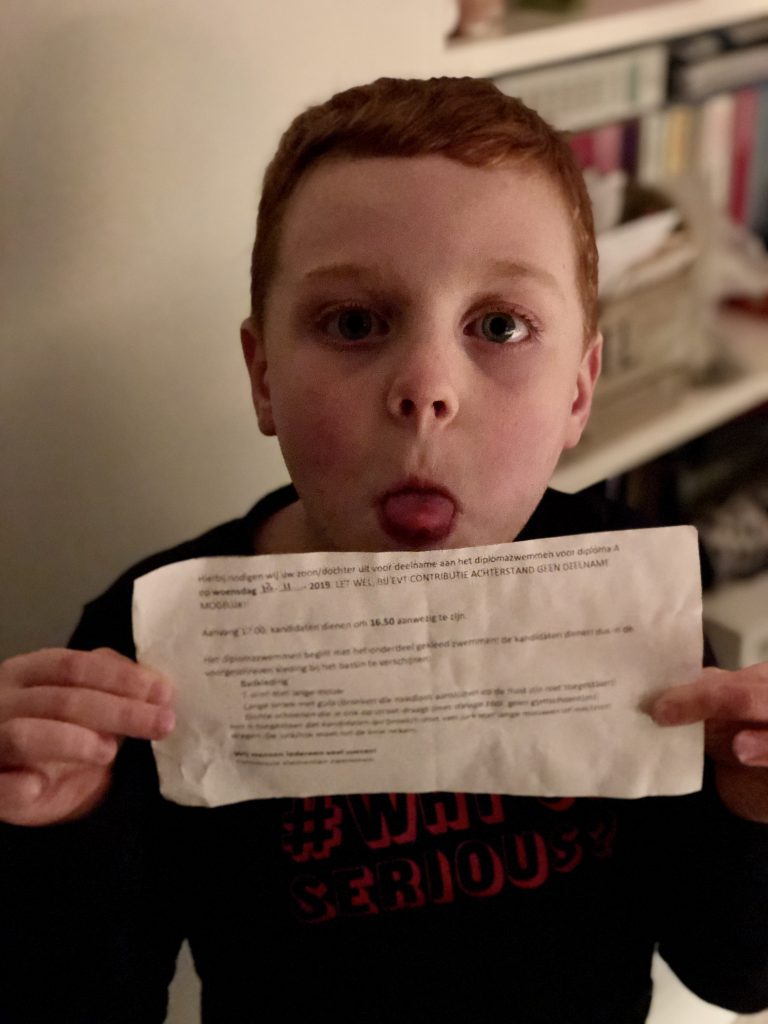 Ondanks het advies om mijn binkie niet te laten zwemmen, besluiten we het toch wel te gaan doen. Zeker omdat hij anders weer een paar maanden moet wachten voor hij mag afzwemmen. Met een eilandpleister en een geleende badmuts van één van de badjuffen, lukt het hem om zijn briefje te halen. En is zijn wond, na het zwemmen nog helemaal droog. Wat echt superfijn is. Het was het risico absoluut waard.