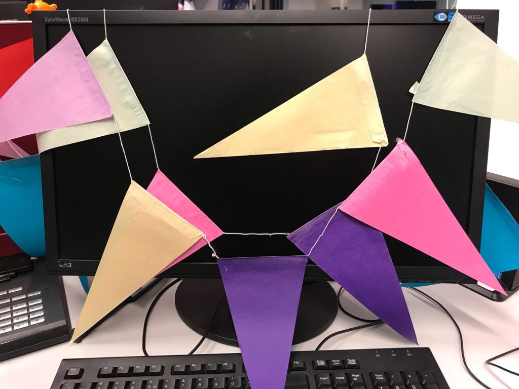 Als ik op mijn werk kom, ben ik blij verrast en verbaasd. Mijn lieve collegaatje regelde slingers via andere collega’s en versierde mijn plekje op kantoor. Echt superlief.