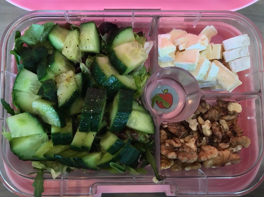 Tijdens de lunch eet ik salade met brie en walnoten.