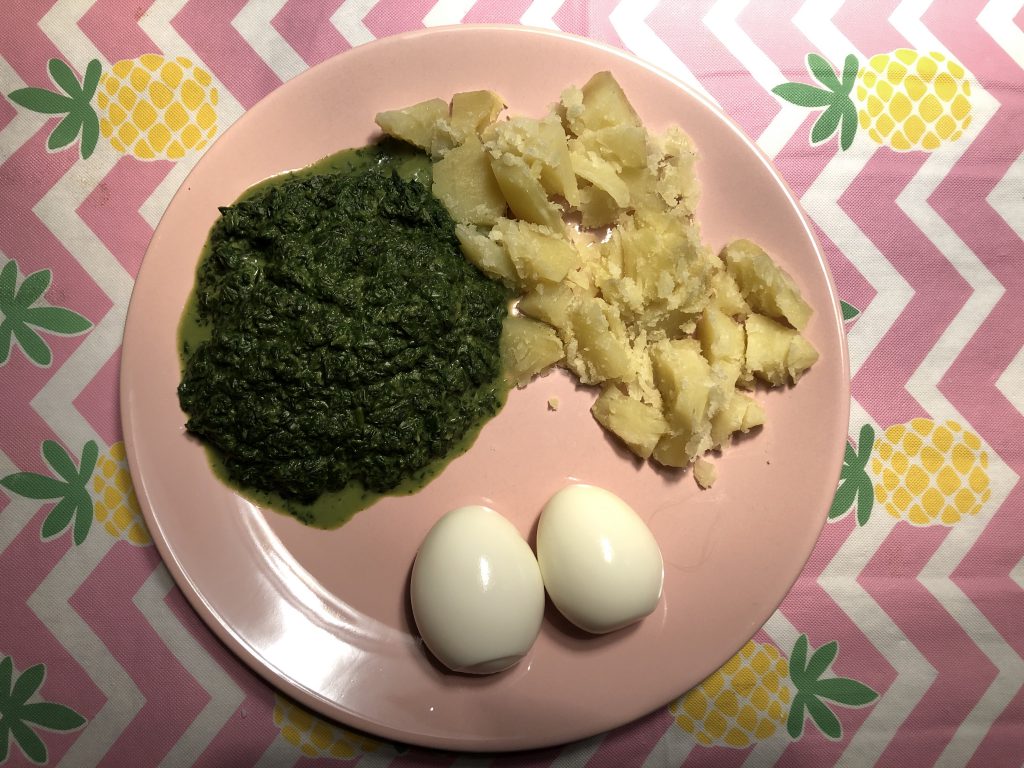 Omdat ik één of twee dagen minder vlees in de week wil eten, kook ik bij de spinazie twee eieren. En ik hoor gelukkig niet één gezinslid klagen, dus ga ik dit mooi verder door zetten. Met dank aan Kari van Columns van Kari, die er een mooie blog over schreef.