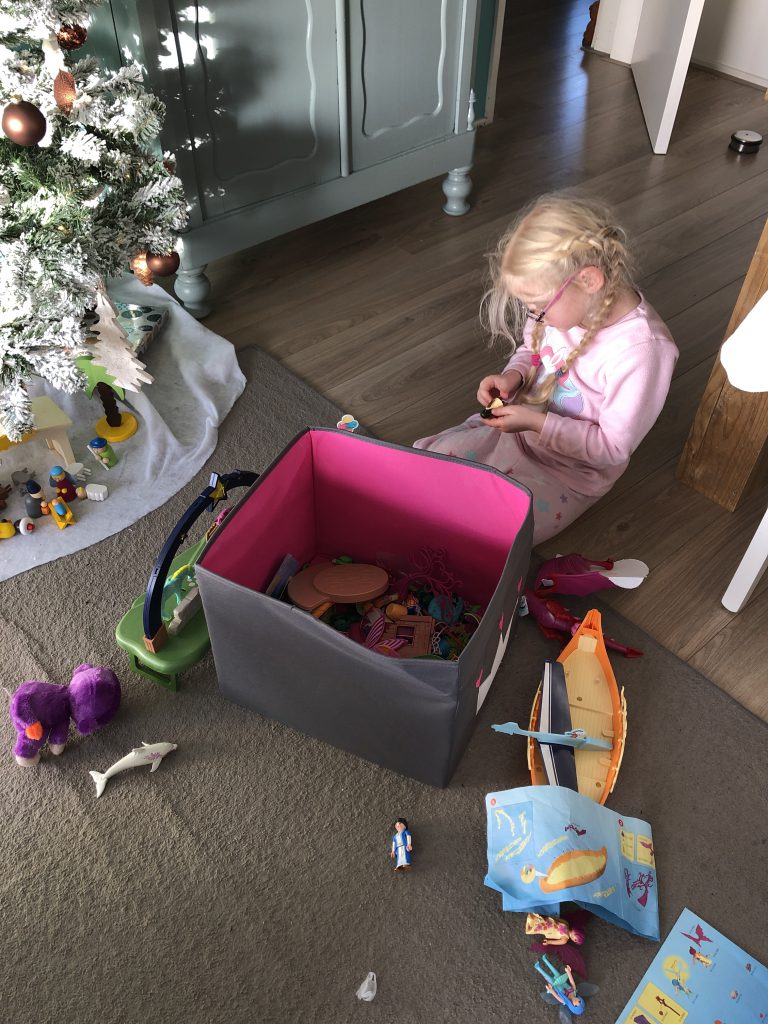 Verder is het vandaag lekker pyjamadag. Na twee dagen nauwelijks zitten is dat wel echt heel erg nodig. Terwijl ik in huis aan rommel, brengt de man samen met onze bink zijn oudste zoon weg. Mijn tuttebel blijft bij mij en vermaakt zich prima met Playmobil.