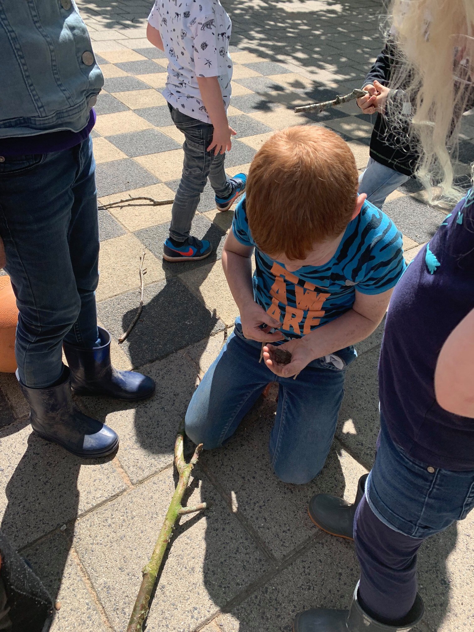 De kinderen zijn nog vrij vandaag en gaan lekker spelen op de bso. Ze vinden er een padje, die uitvoerig wordt bestudeerd.