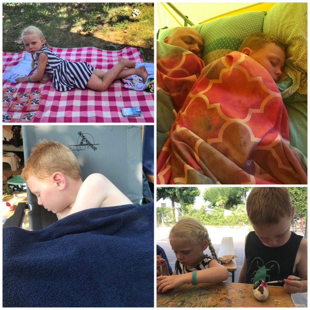 Vandaag begint heerlijk relaxed. Al vrij vroeg is het al best warm en de kinderen vermaken zich bij de kidsclub. Er wordt gespeeld bij de tent en er wordt weer gezwommen. Al is dat na een uurtje over, want Luca voelt zich niet lekker. En nog voor we terug zijn bij de tent heeft hij alles ondergespuugd. Helaas knapt hij daarna ook niet zo snel op en ligt hij ziek in zijn bedje. Hopelijk morgen weer opgeknapt.
