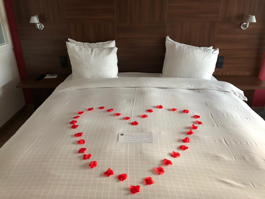 De hotelkamer is over the top romantisch met rozenblaadjes op de grond en op het bed. Wel leuk dat ze er echt werk van hebben gemaakt.