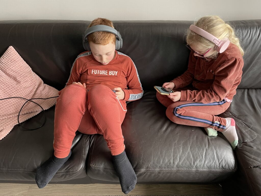 De kinderen hebben bedacht dat ze lekker muziek willen luisteren en samen zitten ze hun eigen muziek te luisteren op de bank. Genietmomentje wel hoor dit.