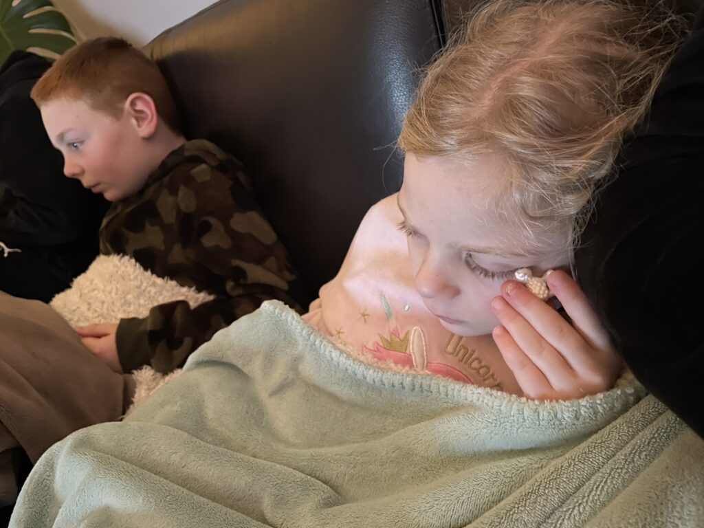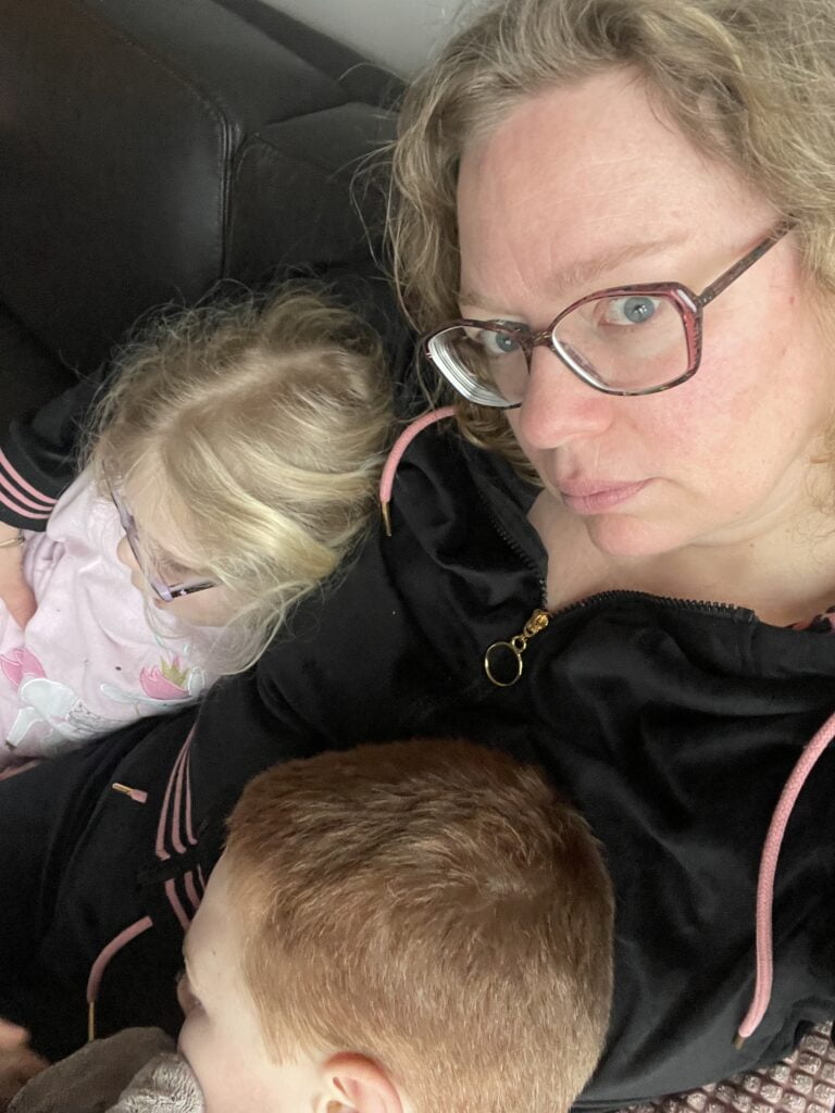 Na een ontzettend slechte nacht ben ik pas om negen uur uit bed. De kinderen kruipen meteen tegen me aan op de bank. Ik voel me net zo slecht als dat ik er op de foto uit zie. Vandaag dus maar verder uitzieken.