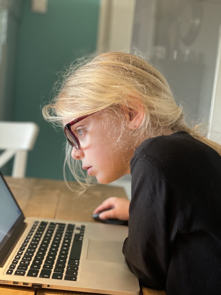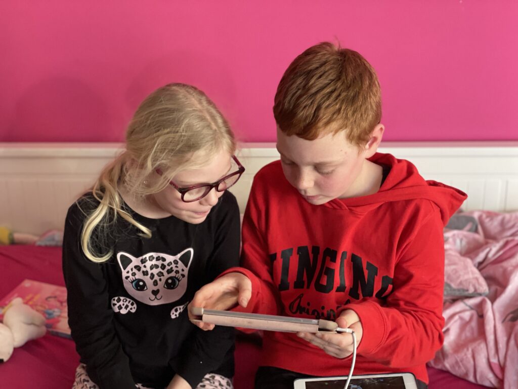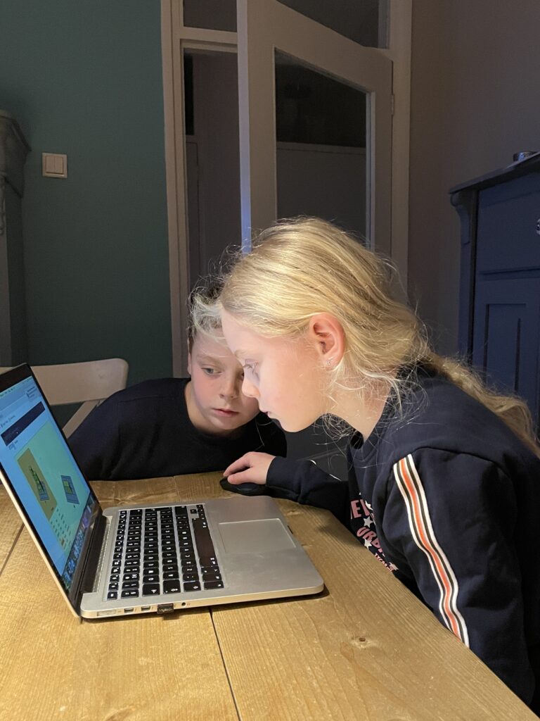 De kinderen gamen samen met een vriendinnetje via Teams en gaan daar helemaal in op.