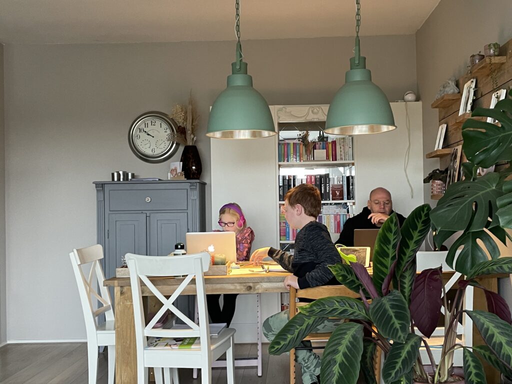 Van twee naar drie naar vier. De man is ook thuis aan het werk nu en het is een gezellige drukte aan onze eettafel.