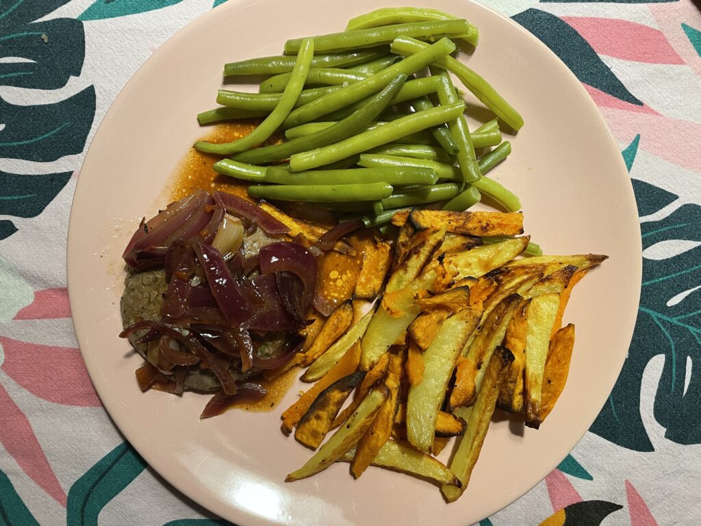 Voor het eerst kook ik een maaltijd van Hellofresh en het is echt superlekker. Zoete en gewone aardappelfrietjes, sperziebonen en Duitse biefstuk met rode uienjus. Er zit ook nog sla bij, die eigenlijk bij de bonen hoorde, maar die heb ik apart gehouden en ook nog zelf gegeten.